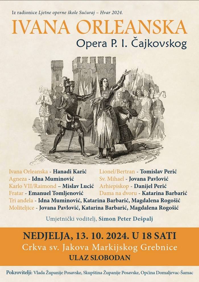 U župnoj crkvi u Grebnicama održat će se nesvakidašnji kulturni događaj. Dana 13.10.2024 (nedjelja) s početkom u 18,00 sati upriličit će se izvedba opere “Ivana Orleanska” proslavljenog ruskog skladatelja i jednog od najvećih skladatelja romantizma Petra Iljiča Čajkovskog. Po prvi put u ovom dijelu Bosne i Hercegovine imamo prigodu sudjelovati jednoj opernoj predstavi.